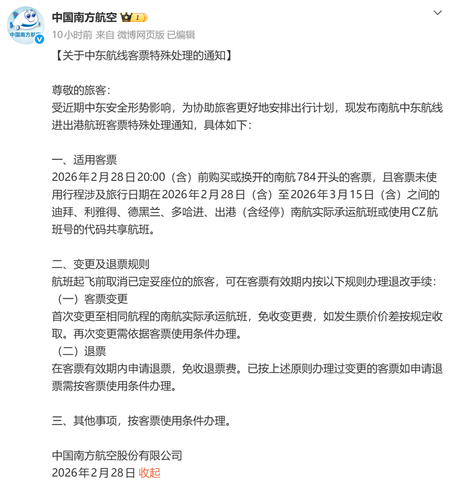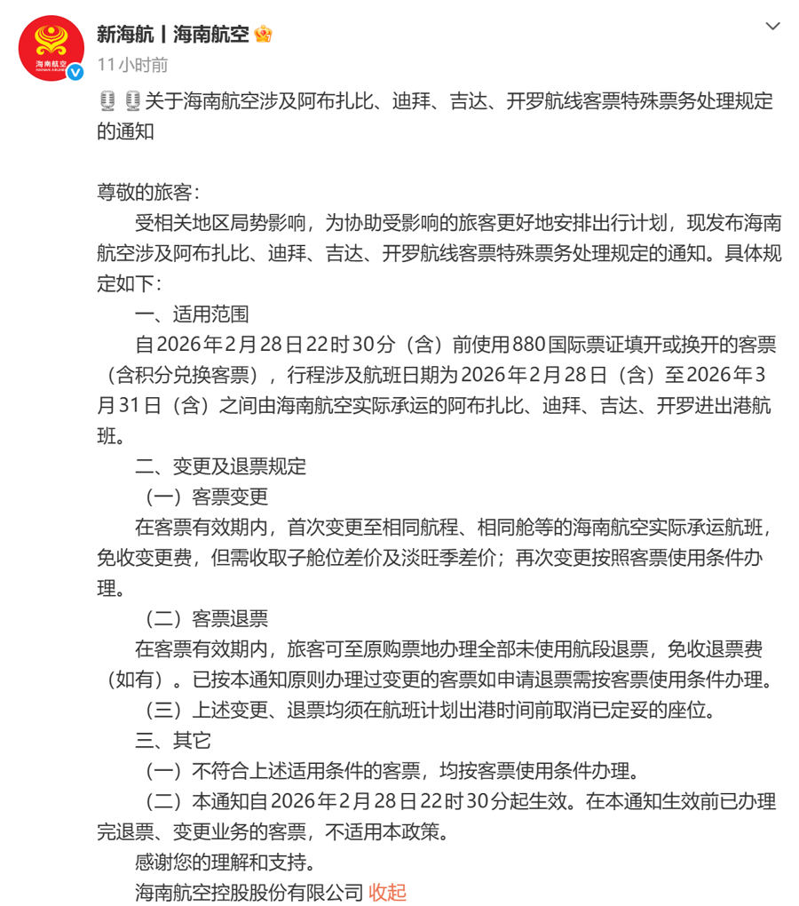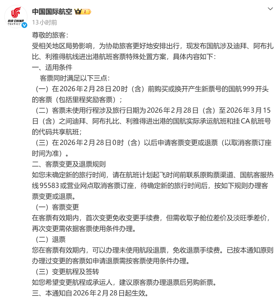 针对当前的突发局势,国内国航、东航、南航、海航等航司已发布免费退改签政策,主要针对2月28日至3月15日,迪拜、阿布扎比、利雅得、德黑兰、多哈等地进出港(含经停)的航班。